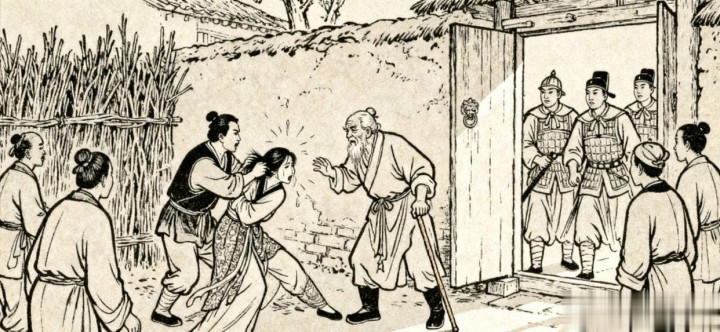 这日,柳老实思念女儿,便拄着拐杖,走了十几里路来看玉娘。刚到张家门口,就听见屋里传来打骂声和玉娘的哭声。他心里一紧,赶紧推门进去,只见张茂正揪着玉娘的头发,把她往墙上撞,地上还散落着破碎的碗碟。